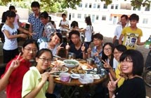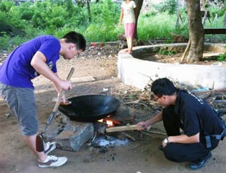 在三教村,志愿者受到了當(dāng)年解放軍進(jìn)城的待遇。由于小學(xué)在施工不便住宿,村民便打開自家新裝修的房子請隊員們住。接著隊員們到露天廚房大展身手,灶臺是由幾個石頭和一個大鐵鍋搭建而成。指導(dǎo)老師看大家興致高,也過來起火,燒柴。有天傍晚,烏云密布,眼瞅著雨就要掉下來,為了能讓志愿者們下雨前吃到飯,熱心的村民為志愿者們買醬料,給他們燒起了飯。
