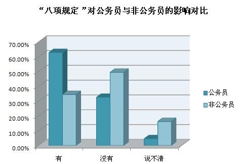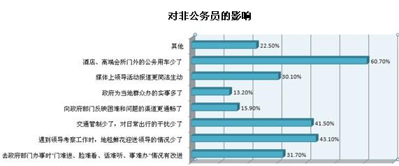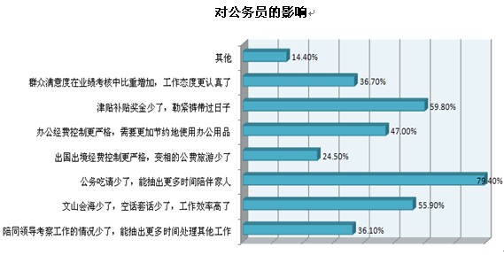 還有三到五成受訪公務(wù)員認(rèn)為“辦公經(jīng)費(fèi)控制更嚴(yán)格,需要更加節(jié)約地使用辦公用品”、“群眾滿意度在業(yè)績(jī)考核中比重增加,工作態(tài)度更認(rèn)真了”和“陪同領(lǐng)導(dǎo)考察工作的情況少了,能抽出更多時(shí)間處理其他工作”是“八項(xiàng)規(guī)定”帶來的幾大影響。