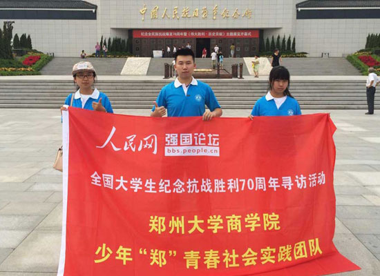 7月16日,鄭州大學“少年鄭青春”暑期實踐隊,開展了“緬懷革命先烈,樹立信心實現(xiàn)中國夢”實踐活動。團隊通過抗戰(zhàn)知識調研、參觀抗戰(zhàn)紀念館、采訪抗戰(zhàn)老兵、向幼兒園孩子普及抗戰(zhàn)知識等方式紀念抗戰(zhàn)勝利70周年。