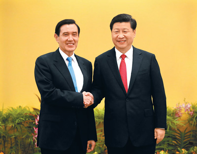 11月7日下午,中共中央總書記、國家主席習近平同臺灣方面領導人馬英九在新加坡會面,就進一步推進兩岸關系和平發展交換意見。新華社記者蘭紅光攝