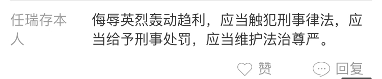 強國論壇網友“任瑞存本人”:侮辱英烈轟動趨利,實屬惡意踐踏正義,須要受到法治懲戒,須要接受道德警示。