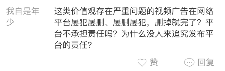 網友“我自是年少”:這類價值觀存在嚴重問題的視頻廣告在網絡平臺屢犯屢刪、屢刪屢犯,刪掉就完了?平臺不承擔責任嗎?
