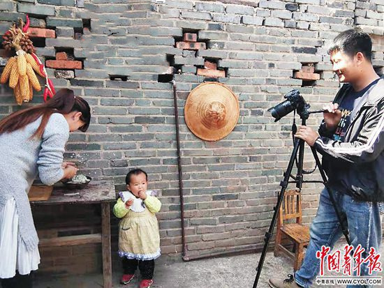 高玉樓從公司白領(lǐng)回到麗江榮將鎮(zhèn)創(chuàng)業(yè)賣芒果,為家人拍攝視頻。(中國青年報(bào))