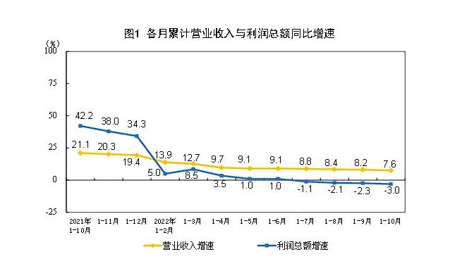 國家統計局數據顯示,今年前10個月,全國規模以上工業企業營業收入同比增長7.6%,利潤同比下降3%。國家統計局工業司高級統計師朱虹解讀工業企業利潤數據時表示,總體看,工業企業利潤下降,結構繼續改善,部分中下游行業利潤回升明顯。但也要看到,近期國內疫情散發多發,世界經濟衰退風險加劇,工業企業效益恢復面臨較大壓力。