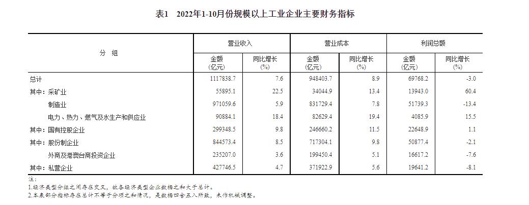 2022年1-10月規模以上工業企業主要財務指標。 國家統計局官網截圖