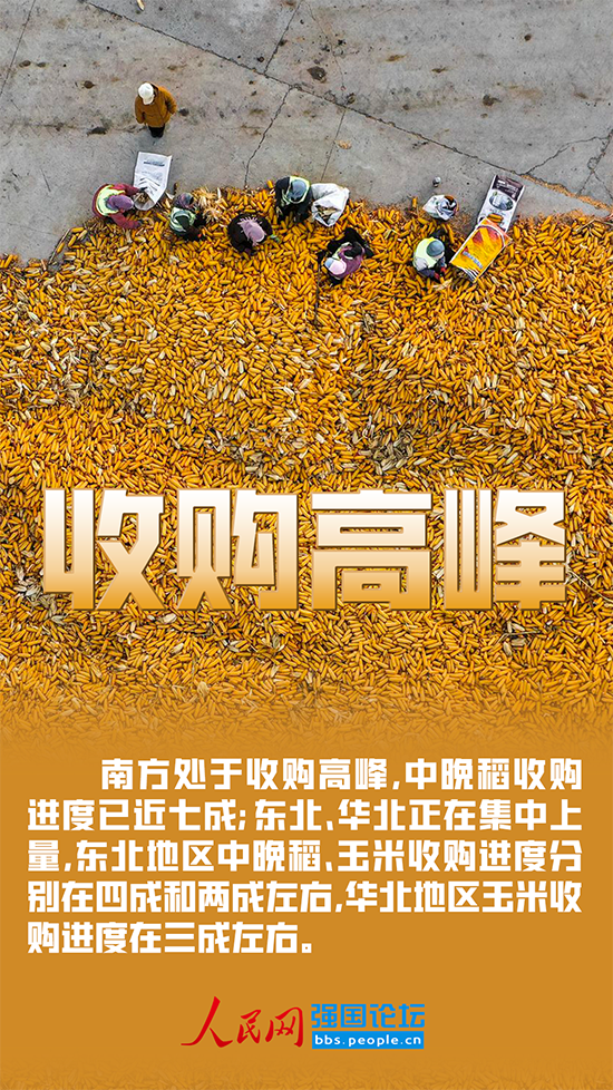 當前,南方處于收購高峰,中晚稻收購進度已近七成;東北、華北正在集中上量,東北地區中晚稻、玉米收購進度分別在四成和兩成左右,華北地區玉米收購進度在三成左右。