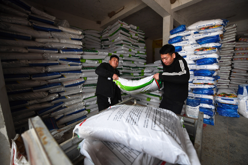 2月8日,河南商丘寧陵縣農民將購買的化肥運到三輪車上。新華社記者 張浩然攝
