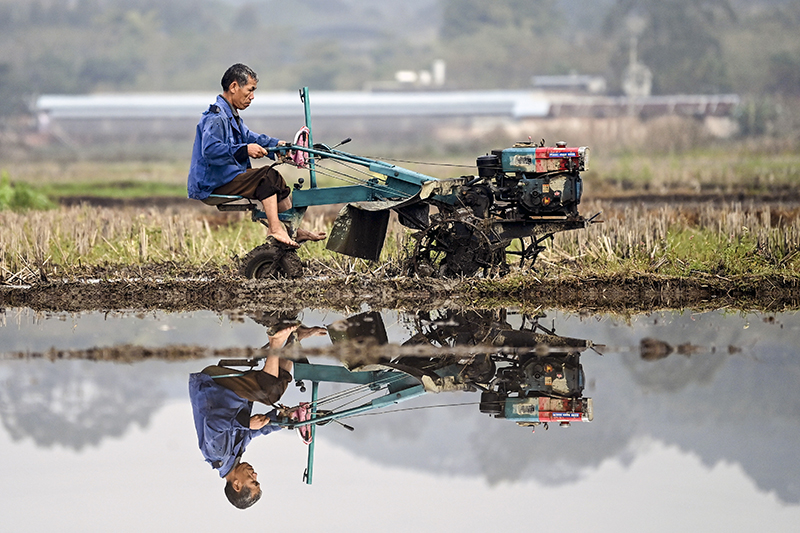 2月17日,廣西欽州欽北區大寺鎮農民在翻耕稻田。新華社記者 張愛林攝